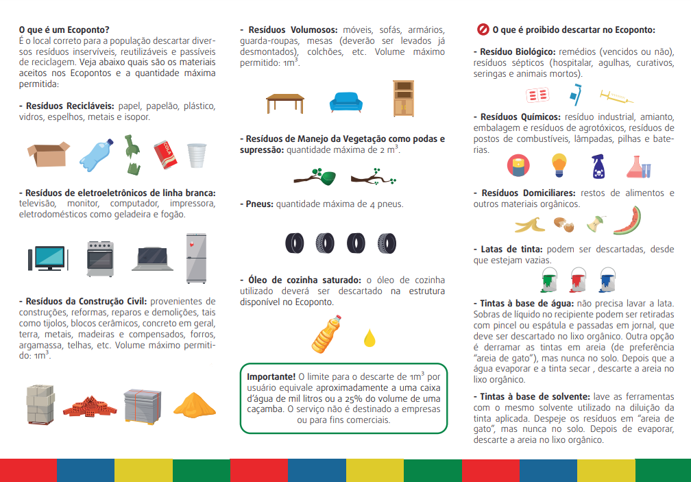 Ao entrar no Ecoponto, o usuário deve se dirigir à coletora destinada ao produto que pretende descartar, sendo que todas têm identificação de qual material recebem. Um funcionário permanece no local apenas para auxiliar, se houver dúvidas. Cada pessoa pode descartar até 1,5 metro cúbico de material, o que corresponde, em volume, a três caixas d’água de 500 litros, por exemplo.